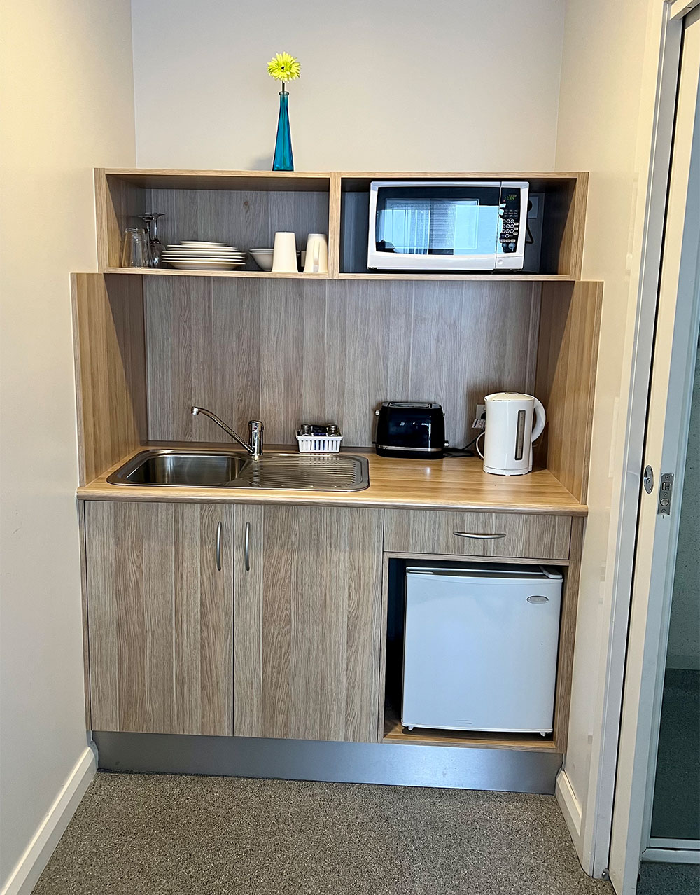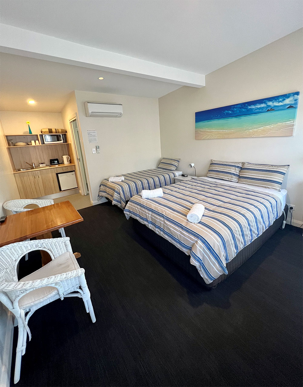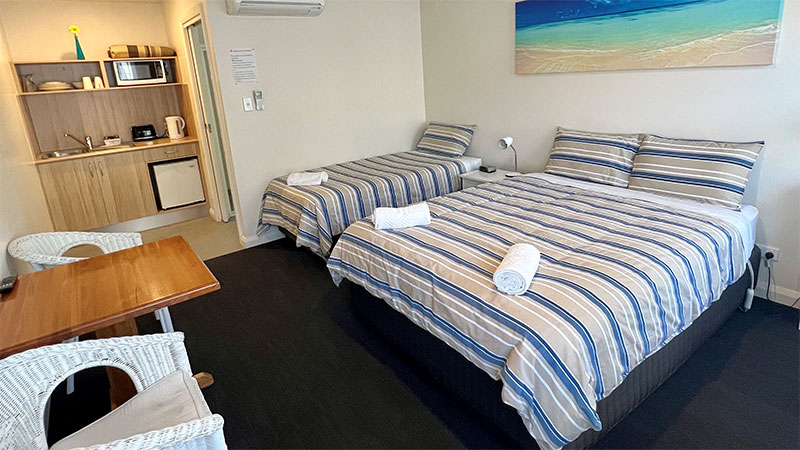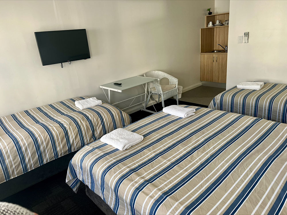 Our family rooms are fitted with a queen-sized bed and two single bed with a private bathroom with a shower. Small kitchenette with microwave, sink, toaster, kettle and a small bar fridge.